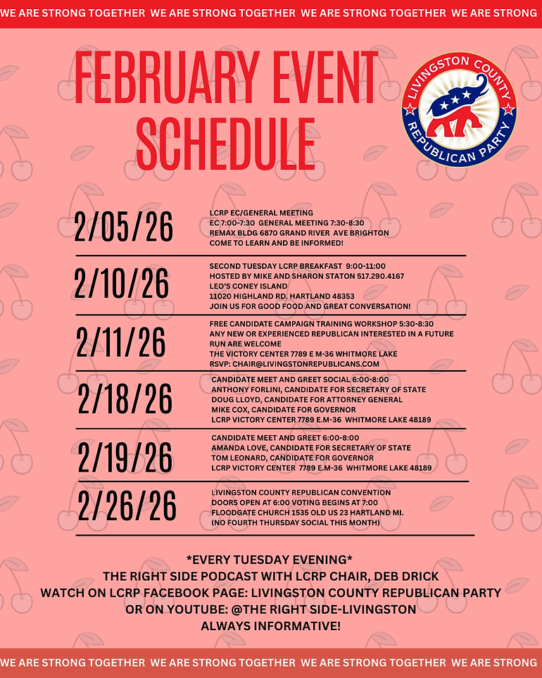 “The Livingston County Republican Party works together to grow membership, to educate and motivate Livingston County residents, to promote conservative values, and support the Republican Primary winners in their elections.”